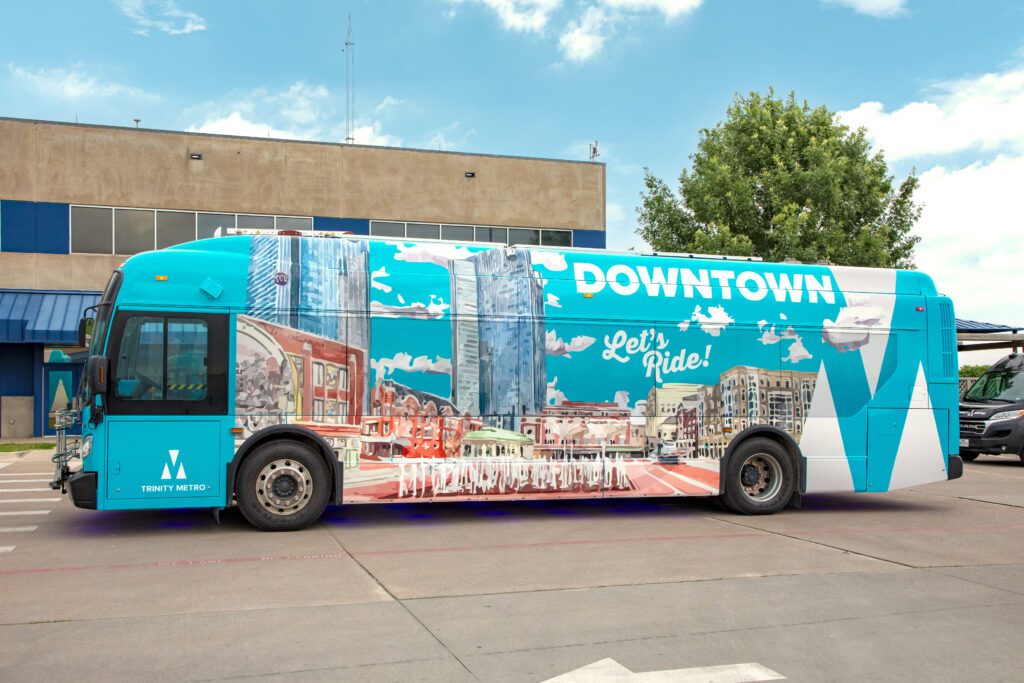 (FORT WORTH, TEXAS) May 27, 2025 —Trinity Metro is excited to announce the launch of the Blue Line, the second of Trinity Metro’s color-coded bus routes, in early June. Visit Fort Worth and Downtown Fort Worth, Inc., are funding partners for the Blue Line, which will help riders travel around downtown. Passengers will enjoy a sleek new riding experience around downtown in bright blue buses with iconic artwork on the exterior. Once aboard the bus, they’ll enjoy comfortable perimeter seating with additional artwork inside and on selected seats.