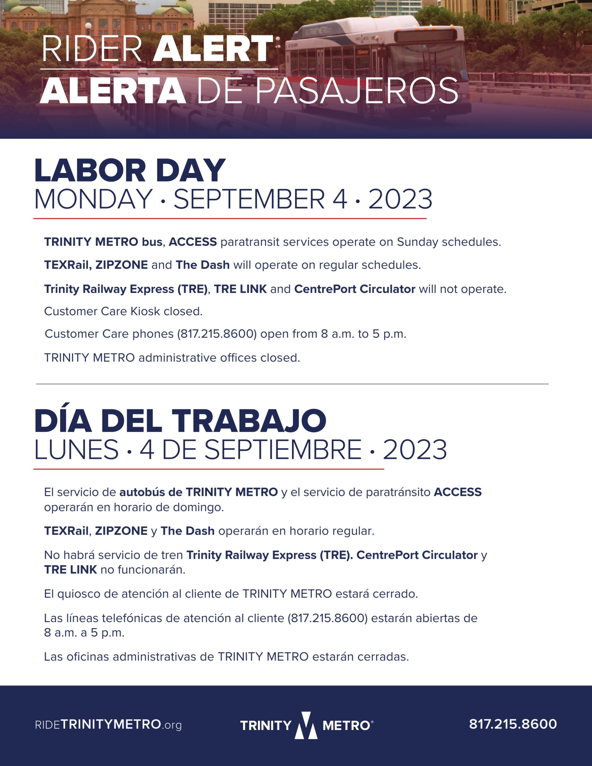 Labor Day is coming up, and we’ve got some service adjustments for the holiday. Buses and ACCESS paratransit will operate on Sunday schedules. TEXRail, ZIPZONE, and The Dash will be on regular schedules. The full details are below. Questions? Call 817-215-8600.