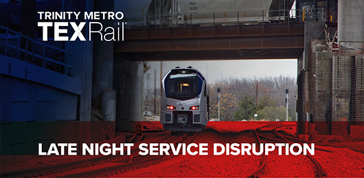 To accommodate scheduled maintenance, TEXRail will have a brief service disruption late Sunday, July 23, and in the early hours of Monday, July 24. Regular service will resume at 3:20 a.m. Monday.