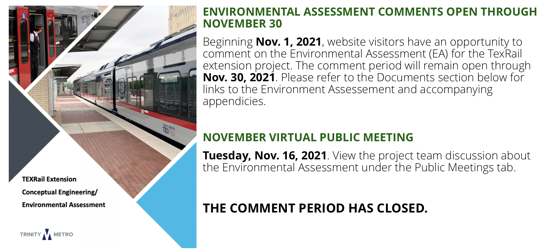 Thank you for joining us for the Tuesday, Nov. 16, 2021 opportunity to discuss the Environmental Assessment for the new proposed TEXRail station.