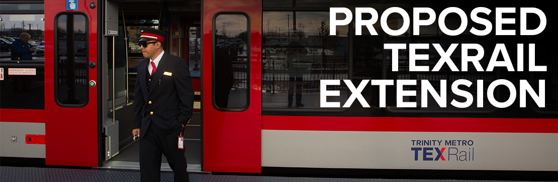 Trinity Metro’s 27-mile TEXRail commuter rail line travels from downtown Fort Worth through North Fort Worth, North Richland Hills and Grapevine to the northern entrance of Dallas/Fort Worth International Airport, ending at DFW Terminal B. Trinity Metro is planning to extend the commuter rail line south from the Fort Worth Texas & Pacific (T&P) Station, where TEXRail currently terminates, to the proposed Near Southside Station in the Fort Worth Medical District.