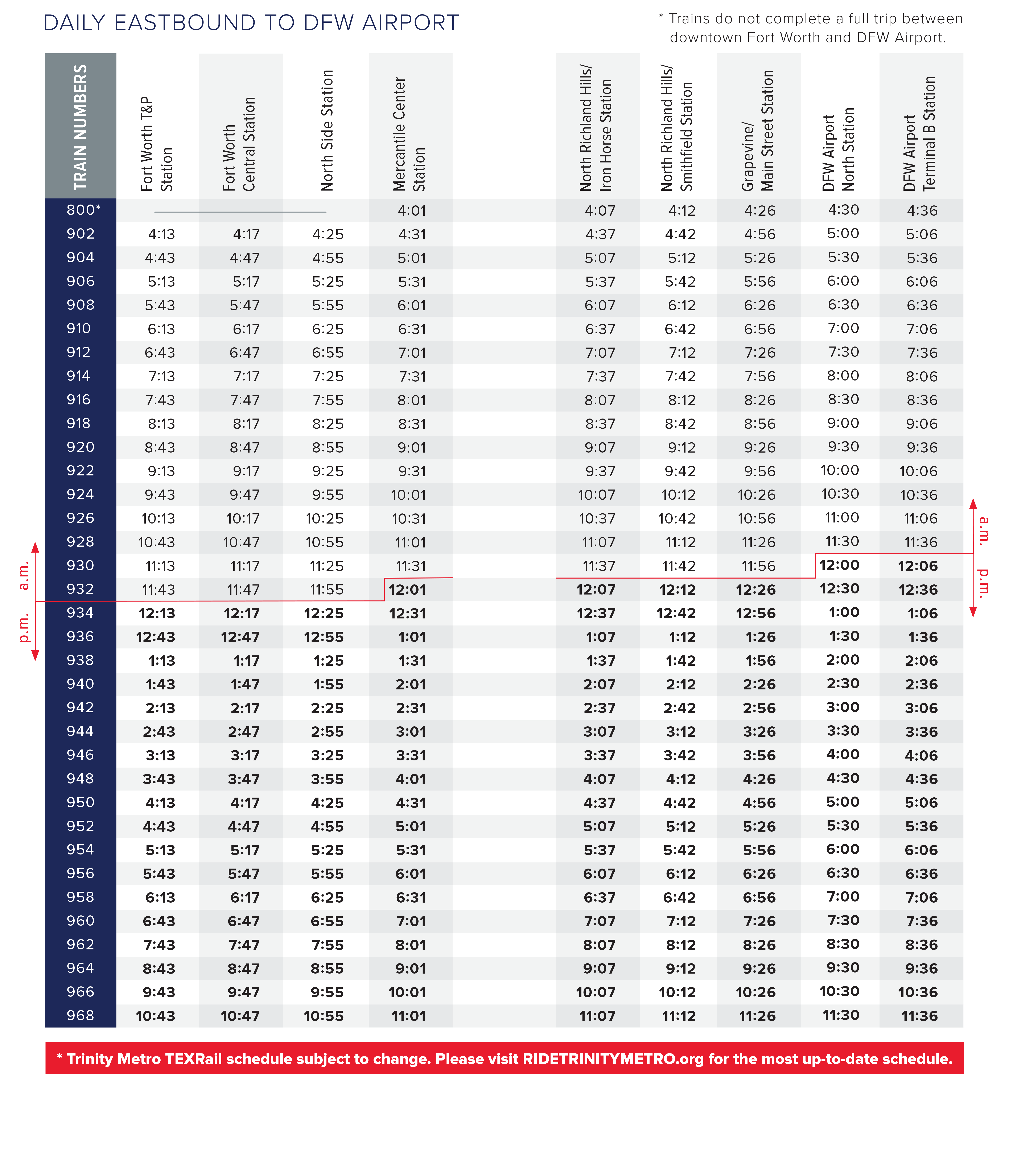 To accommodate construction for safety enhancements at Fort Worth Central Station, Trinity Metro TEXRail service will be disrupted on two Sundays in February and three Sundays in March.